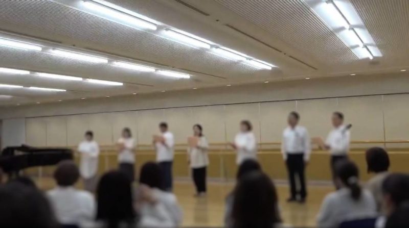 各校の発声練習や体操の紹介、合唱発表のあと、最後に参加者全員で合同合唱しましょう!という企画のもと、『Ave verum corpus(アヴェ・ヴェルム・コルプス)』モーツァルト作曲/混声四部合唱曲を 30 分ほどのパート練習後、総勢約 60 名で歌いました。