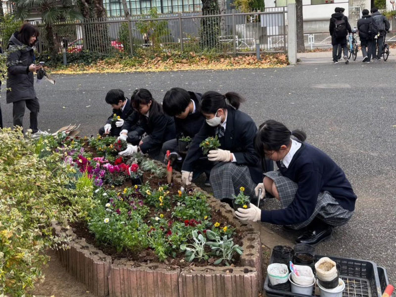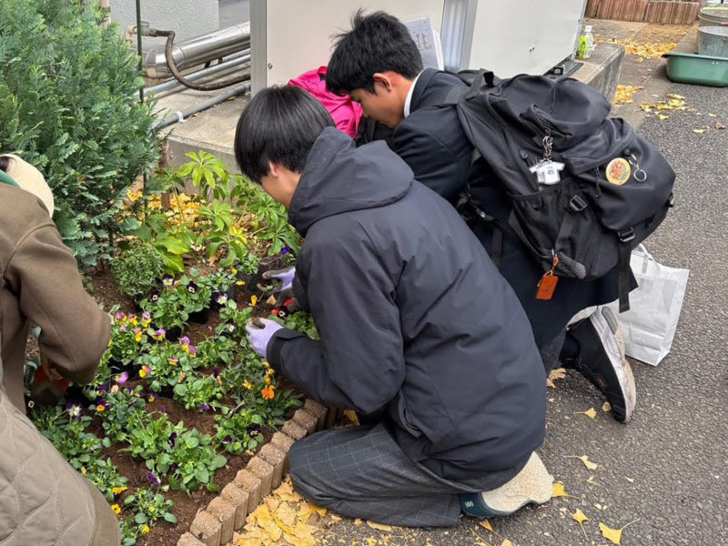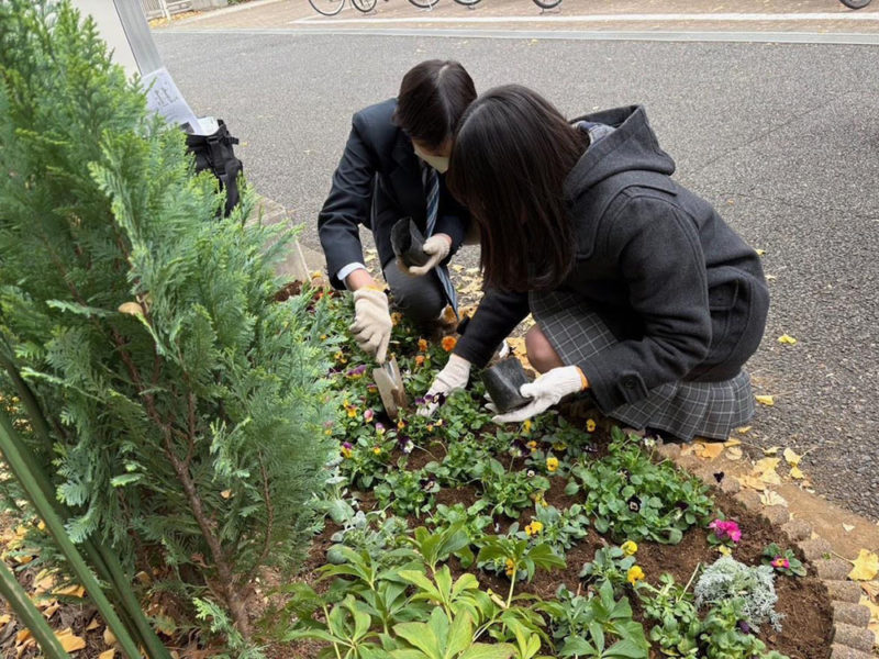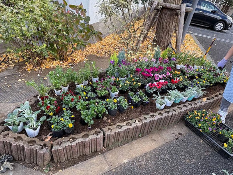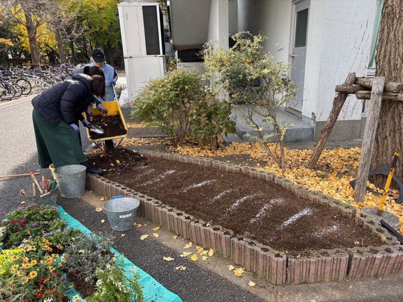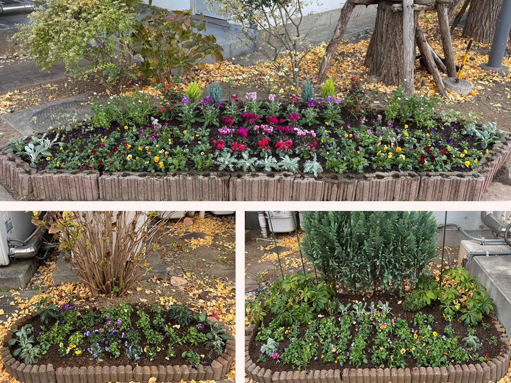 12 月初めの土曜午前に 3 班の花の植え替えを行いました。約 3 ヶ月前に2 班が植えた秋の花を全て取り除き、腐葉土と肥料を混ぜ土を耕し土壌を整えます。その後、花壇約9割分の花苗を植え、授業を終えた生徒の到着を待ちました。