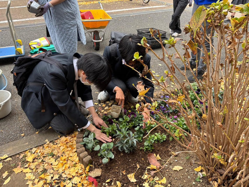花を 1 人1苗植えようという初企画「一人一花活動」の始動です。下校途中の飛び入り参加もあり、花を愛する 10 人以上の学生ボランティアとPTA 植栽委員会のコラボレーション花壇が実現し、心が温まりました。