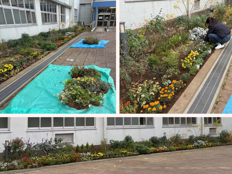3つの花壇から抜き取った花は保健室北側花壇に移植されます。2年前から少しずつ開拓を進めてきたこの花壇は、3ヶ月ごとの植え替え時に宿根草や一年草が移植され、緑の多い一連の花壇となりました。