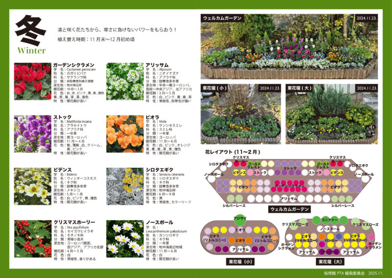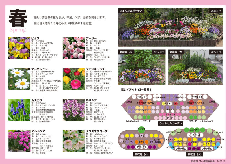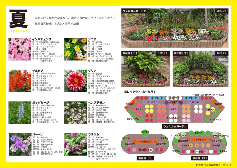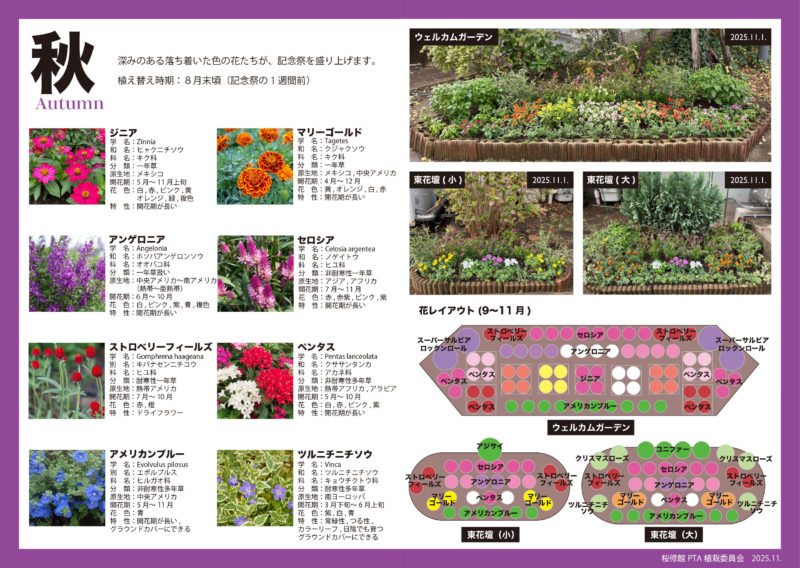 今後の委員会活動の継続と植え替えの効率化を願い、花壇レイアウト参考図と花図鑑を作成しました。