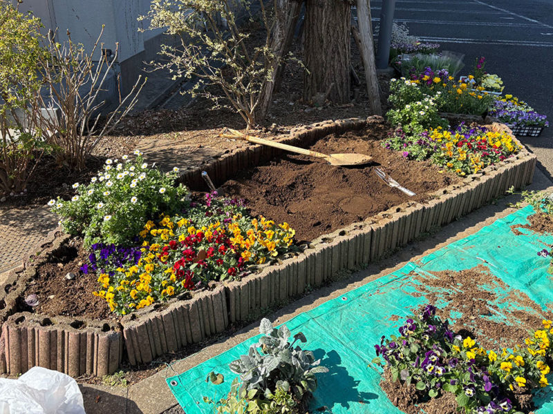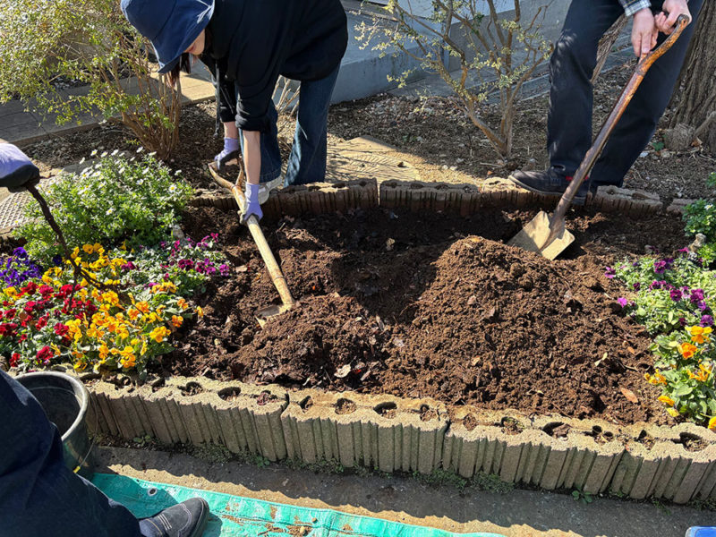 株を取り除いた部分にはフィールドワーク部が作った落ち葉堆肥を混ぜて耕し、保水性・排水性・通気性の高いフカフカな土壌を作ります。植物が根を広げ花を多く咲かせるために欠かせない作業です。何事も目には見えにくい土台作りが重要です。