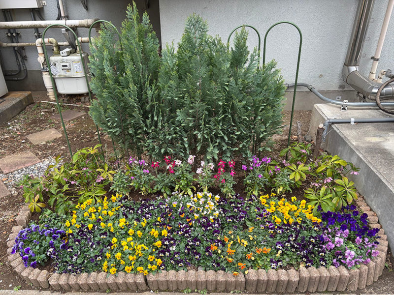 ビオラは4苗を1単位とし色の量感を持たせ、黄色と紫の市松模様の配置によりメリハリやリズム感を演出しています。隣り合う補色は互いの色を鮮やかに引き立てています。後方両側のクリスマスローズは、毎年3月頃に可憐な花を咲かせます。