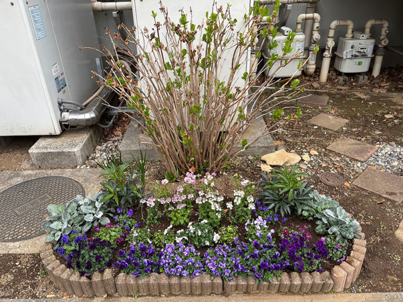 通用門から3番目の小さい花壇です。紫と白を基調にしたビオラの後方にピンクのストックと薄紫のメネシアを配置し、可愛らしさが増しました。後方の紫陽花の芽吹きにも春の到来を感じます。