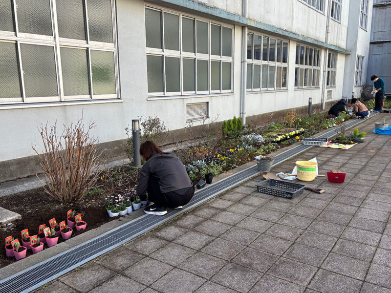 卒業式の1週間前、植栽委員4 班メンバーが6 年生に祝卒業の気持ちを込めて花の植え替えをしました。