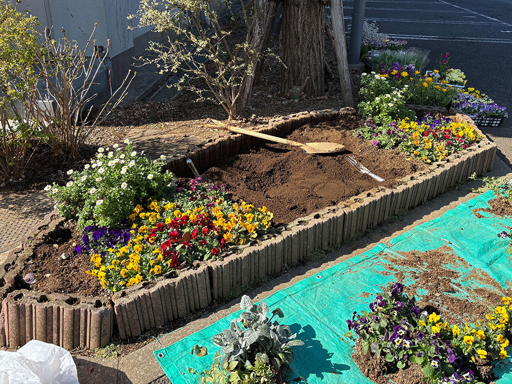 ウェルカムガーデンでは、12 月に植えたビオラとノースポールを一部残し、中央部分と両端部分を春向きの花にチェンジすることにしました。